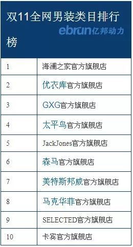 按产品分类,男装卖得最好的是“国民男装”海澜之家。男装排名第二的是优衣库,入选前10的品牌还包括GXG、PEACEBIRD MAN、杰克琼斯、花花公子、森马、马克华菲、美特斯邦威和波司登。