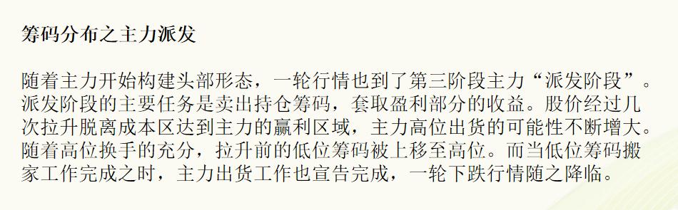 筹码分布由于采集的是上市公司的所有数据,所以在参考时则以中长线主力。在筹码所处的四个不同的阶段里,并不是所有的主力都能够完全出货,这主要是受于大盘环境的配合。所以,在以个股参考筹码分布运用的同时,大盘的方向也不能忽略。如果您还处于不断的盲目追涨时,那一定要了解筹码是如何派发,并完成收尾工作。