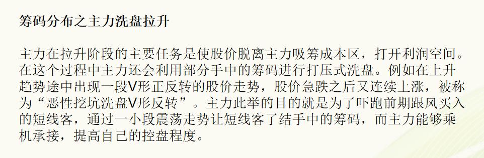 在主力拉升过程中,部分股民纷纷追涨,同时又有部分股民获利回吐。主力虽然会利用手上的已有筹码来进行打压洗盘,但其大部分筹码仍然按兵不动地留在了吸筹区域,等待高位卖出。特别是对于控盘技巧较好的主力,如果有大趋势的配合,主力往往只需要点上一把火,拉升工作主要由股民自行完成,主力主要是利用控盘能力调控拉升节奏。所以从筹码分布图上看,在主力拉升阶段,成交异常活跃,筹码加速转手,筹码在慢慢上移,各价位的成本分布大小不一,但是底部部分筹码依然被锁定,直到主力开始构建顶部形态。