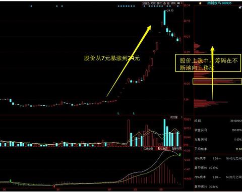 此时底部筹码大量并迅速上移。这个过程已经在其他的章节里多次重点强调,这里不在赘述;