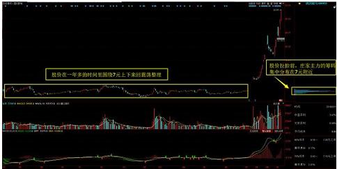 从筹码分布图上看,主力吸筹的过程就是一个筹码换手的过程。在这个过程中,通常主力是买入方,我们小散是卖出方,在股价低位完成筹码的充分换手是吸筹阶段完成的标志。所谓充分换手就是在一定的价格区域成交高度密集,使分散在各个价位上的筹码充分集中在一个主要的价格区域。
