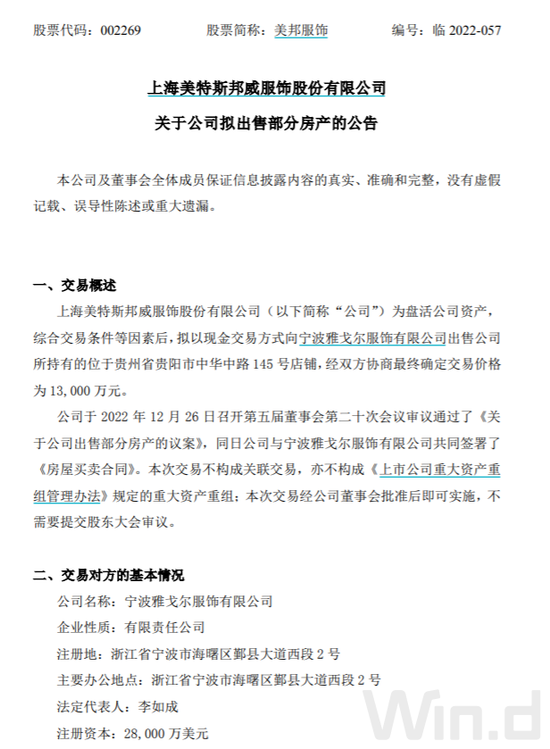 美邦接连卖店,雅戈尔买买买,两位浙商大佬谁赌对了?时间:2022-12-29 两位同来自于浙江的服饰大佬,互相做起了“房产”生意。 在经历了“闭店潮”之后,美邦服饰 似乎又“爱上”了卖店。 12月26日,美邦服饰 公告称,向雅戈尔 出售公司所持有的位于贵州省贵阳市中华中路145号店铺,最终确定交易价格为1.3亿元。 ![]() 来源:美邦服饰公告 美邦服饰指出,本次交易有利于公司盘活现有资产,符合公司战略规划。本次交易所得款项将用于补充公司流动资金,对公司的财务状况及经营成果将产生积极影响。 值得一提的是,不到两个月前,10月底,美邦服饰曾以1.9亿元向雅戈尔出售其位于湖北省武汉市光谷世界城西班牙风情街1幢B单元的店铺。 在业内人士看来,美邦服饰年底频频出售店铺,源于自身业绩的压力。巨额的亏损,美邦服饰年报并不好看,而通过出售相应资产,一定程度上能弥补业绩的亏损甚至实现扭亏。 而买方宁波雅戈尔为另一上市公司雅戈尔下属企业。关于购买房产一事,雅戈尔表示,公司购买店铺的原因是为了持续发展时尚产业,进一步落实大店战略布局。 在美邦服饰和雅戈尔交易的背后,是两位浙江大佬之间的博弈。1994年,浙江丽水人周成建开始创立自己的品牌,次年在温州开设第一家“美特斯邦威”专卖店,之后一度成为国产快时尚品牌巨头。 作为浙江老乡,李如成从1991年起担任宁波雅戈尔制衣有限公司董事长兼总经理,随后掌舵雅戈尔集团,并逐步跨界地产、股权投资等领域。2022年胡润全球富豪榜上,李如成以120亿的身家成功上榜。 同为从浙江发家的服装品牌,均曾引领国内服装行业的潮流。如今,一进一退,也从侧面反映了两家公司截然不同的生存状况。 从闭店到卖店,美邦如何避损? “美特斯邦威,不走寻常路。”曾经名噪一时的美邦服饰,用一句口号让自己变得家喻户晓。在高光时刻过后,美邦服饰的发展开始逐步放缓,门店数量开始快速下降。 2008年8月,美邦服饰在深交所挂牌上市,当时《招股书》披露的门店数量为2211家。2012年,其门店数量达到5220家,其中加盟店3914家,直营店1306家。 从2019年开始,美邦服饰迎来一波“闭店潮”。2019年至2021年门店分别减少785家、683家和403家。2022年上半年,美邦服饰关闭直营店77家,关闭加盟店317家;而新开直营店只有3家,新开加盟店40家。 ![]() 来源:罐头图库 然而,通过关店调整并没有改变美邦服饰的颓势,于是美邦服饰开始连续出售门店,用于盘活资产。 早在2021年4月,美邦服饰就曾出售上海模共实业有限公司100%的股权,交易金额合计4.48亿元。交易后,美邦服饰可获得税前收益约为2.5亿元。 同年6月,美邦服饰以4.24亿元出售上海华瑞银行股份有限公司10.1%股份,理由同样为盘活现有资产。 美邦服饰表示,交易是为了补充公司流动资金,有助于解决公司再生产流动资金和负债率问题。美邦服饰进一步指出,要将沈阳、武汉、南昌、厦门、昆明、北京、贵阳、西安等多地的物业资产做进一步处理。 然而,这并没有改变美邦服饰业绩下滑的状态。2018年-2021年,美邦服饰的营收分别为76.77亿元、54.63亿元、38.19亿元和26.38亿元。 ![]() 来源:Wind 最新财报显示,今年前三季度,美邦服饰营收为9.68亿元,同比下降49.93%;净利润亏损约7.59亿元,同比下降283.8%。美邦服饰称,主要由于报告期内经营活动现金流量净额减少和信用损失增加所致。 与此同时,美邦服饰还面临较大的流动性压力。三季报显示,美邦服饰的短期借款及一年内到期的非流动负债为11.35亿元,同期其现金及现金等价物仅为0.38亿元。 对此,美邦服饰表示,从8月底到目前为止,公司对外债务都在按照和供应商的约定,在按计划偿还。这次房产出售的款项将继续用于新的产品生产中。 盘古智库高级研究员江瀚表示,美邦服饰业绩惨淡并非卖资就能解决。美特斯邦威品牌老化,产品设计能力长期缺失,难以留住老用户,又无力吸引新的年轻消费群体。长此以往,业绩出现下滑甚至亏损。 ![]() 来源:罐头图库 除了出售资产回血,美邦服饰已经意识到,伴随数字化发展与新零售业务模式的兴起,如何基于Z世代消费者的需求进行产品优化和渠道升级,是更加紧迫的问题。 此前,美邦服饰已经通过独立童装品牌MeCity Kids(米喜迪)、MOOMOO布局童装业务。2021年上半年,美邦服饰对童装品牌进行品牌升级,线上商城全面升级焕新,线下首批3家形象门店也已重新开业。 除此之外,2021年底,美邦服饰发布先锋潮牌metersbonwe系列新品,定位以“95后”“00后”为主的Z世代年轻消费群体。2022年初,推出上海千树先锋概念店,正式发售“锋芒新生”2022春夏秀款限定系列。 在江瀚看来,作为老品牌,有着一定的品牌影响力和消费群体。在如今国货颇受欢迎的当下,美邦服饰如果能抓住国潮机会,凭借品牌多年的影响力推出好的产品,与年轻消费者建立链接吸引新消费群体,或许还有机会翻身。 主业不“主”,雅戈尔地产正红 同为服装企业,美邦服饰和雅戈尔对待地产业务的态度大相径庭,其主要原因还是与二者在地产领域的成绩相关。 截至目前,雅戈尔已经在房地产领域深耕30年。从1992年涉足房地产开发起,雅戈尔在宁波、苏州等地相继开发东湖花园、东湖馨园、都市森林等楼盘,累计开发各类物业300万平方米。 ![]() 来源:罐头图库 在持续深耕的同时,地产业务也给了雅戈尔不错的反馈。2019年-2021年,雅戈尔地