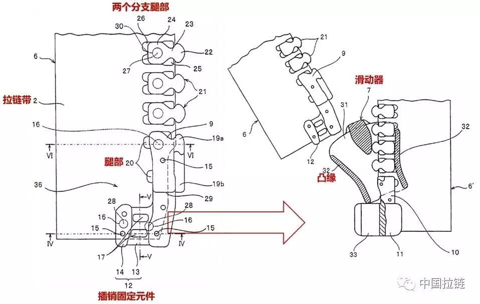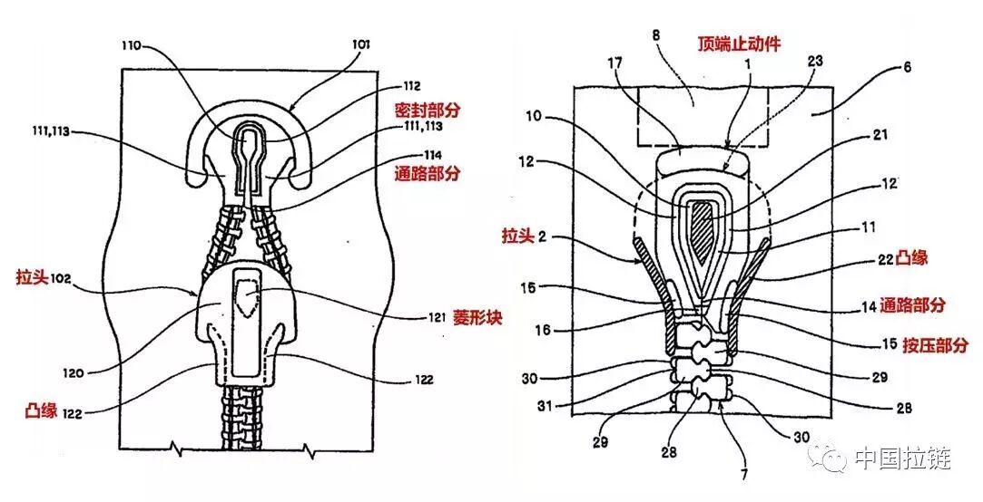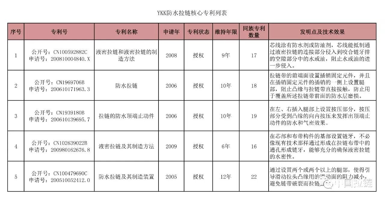 YKK公司核心专利解读——防水拉链方向时间:2017-07-25 概述:近年来, 随着市场上防水拉链的用途越来越广泛,以及市场对拉链液密性的要求更为严格,YKK拉链防水拉链更注重液密性拉链的制造研发,民用防水拉链主要用于滑雪衣、羽绒服、雨衣、防水鞋、手提包及休闲冲锋衣等服饰饰品上,工业YKK防水拉链主要用于航海、航空、极地考察等领域的防水防寒。 鉴于近年来防水拉链的热度和YKK拉链在世界的市场份额,研究YKK中国拉链在防水拉链上的核心专利尤为重要。截止至2017年4月30日,检索到YKK中国拉链专利1487项,防水拉链相关专利186项,通过被引证频次、同族专利数和专利价值筛选出以下5项核心专利,详见下表所示。 技术方案详情: 1.液密拉链和液密拉链的制造方法 技术问题:当拉链用于诸如运动装之类的衣服并且穿该衣服的人进行剧烈运动,拉链因运动而发生变形,又或者当拉链用于包,而包内物品超过包的容纳能力时,非常大的横向拉力被作用到拉链上,液密层的相对侧边缘可能拉开而使拉链的连接部分处的间隙倾向于加宽,产生水更容易侵入的缺陷。 解决方法:通过沿着液密拉链中的液密层的连接部分和咬合链牙排之间的空隙部分布置芯线,并且芯线经过防水处理或防油处理,即使连接部分的间隙扩大,穿过液密层的连接部分侵入的水或油被芯线表面阻挡,水或油也不会通过芯线渗透到拉链后面,但会在在液密层和咬合链牙排之间的空隙部分附近聚集。结果,在空隙部分聚集的水防止更多水通过连接部分侵入,从而不必在液密层的连接部分设有止水片,由此保证预定的防水性能。 2.防水拉链 技术问题:当在常规的防水拉链中重复插入插销的操作时,在插销固定侧上的拉链带的前端面与滑动器的肩嘴接触,并且拉链带的前端区域与滑动器的凸缘摩擦。由于这个原因,用在拉链带上的防水层磨损了,从而拉链带可能松开或者损坏。因此,拉链的防水特性降低。 解决方法:在横跨位于插销固定侧上的拉链带的前端面上设置插销固定元件,拉链带的前端部受到插销固定元件的保护以进行缠绕。因此,即使重复进行把插销插入盒的操作,亦可防止带的前端部的松散和损坏,以此来维持拉链的良好防水特点。 另一方面,在插销固定元件的插销的一侧上设置腿部,并且每一个拉链元件设置两个分支腿部,当拉链元件上的滑动器滑动时,由于腿部与滑动器的凸缘接触,从而阻止凸缘与拉链带直接接触,可以防止用于覆盖所述拉链带前面的防水层磨损,覆盖拉链带的防水层可由凸缘保护而不受磨损或损坏。 3.拉链的防水顶端止动件 技术问题:当拉起拉头时,拉头的凸缘应与带有菱形块的通路部分形成紧密接触,以便使通路部分形成在内密封部分中。通路部分的侧面通过拉头的凸缘恰好彼此相互接触。但是,因为仅仅是通路部分的侧面接合在一起,所以水有可能穿透或浸入通路部分。 解决方法:在左、右插入腿部上设置按压部分,由于通路部分形成在顶端止动件的插入腿部中,当拉头滑向顶端止动件时,形成在顶端止动件的插入腿部外边缘部分上的按压部分受到拉头凸缘的挤压,从而插入腿部被向内推动以使各通路部分相互产生压力接触,按压部分受到凸缘的向内按压,使通路部分的左、右两部分彼此紧密地接触在一起,以便将通路部分密封,就达到了防水和气密的效果。 4.液密拉链及其制造方法 技术问题:由于在拉链布带中形成通孔,如果链牙形成在与通孔错位的位置,则水密性被损害。因此,需要高精度地定位链牙。 解决方法:在芯部和布带构件的基部设置链牙,由于液密层在宽度方向上与芯部形成有间隔,因此不必像现有技术那样通过形成在拉链布带中的通孔形成链牙。因此,能够充分的确保液密拉链的水密性,而不管链牙形成的位置。另外,将防水剂或防油剂附着于拉链条。由于防水剂或防油剂被附着于拉链布带的所有的布带构件、芯部和液密层以及链牙,所以能够进一步增强防水/防油效果。 5.防水拉链及其制造装置 技术问题:如果链元件不包括用来引导滑动拉头上下叶片上形成的左右凸缘部的上下反面的滑动的任何部分,凸缘的上下反面可能与链带形成滑动接触,这样,链带前后两面上的合成树脂层可能被磨裂,由此可能导致防水性能降低。 解决方法:通过设置两个或两个以上的腿部,滑动拉头的上下凸缘与每个腿部的每个上下半部中的表面形成滑动接触,每个半部则经分叉部从本体部延伸并引导凸缘,引导滑动拉头凸缘部用的滑动面必然被减少,以使滑动滑动拉头时滑动阻力得到减小,由此使滑动操作顺畅,这样就不怕链带表面可能被磨裂。 另外在本发明的制造装置中,如果在肩部的每个半部模腔中左右端面间的最大长度被设置得大于其左右端部间本体部模腔的长度,接合头的半部的内面当链元件如上述被啮合时就在一大范围内与每个肩部的半部的表面形成接触,由此,防水性能就得到加强。 |