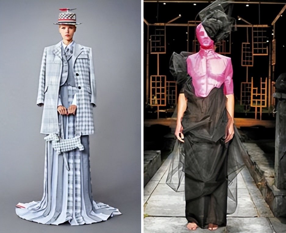 Thom Browne春夏玩弄颠覆戏法,左图将西装格纹布拼接出女神般的晚装Look。右为以错视雕像上衣搭配立裁黑纱,创造出跨性别的晚礼服。