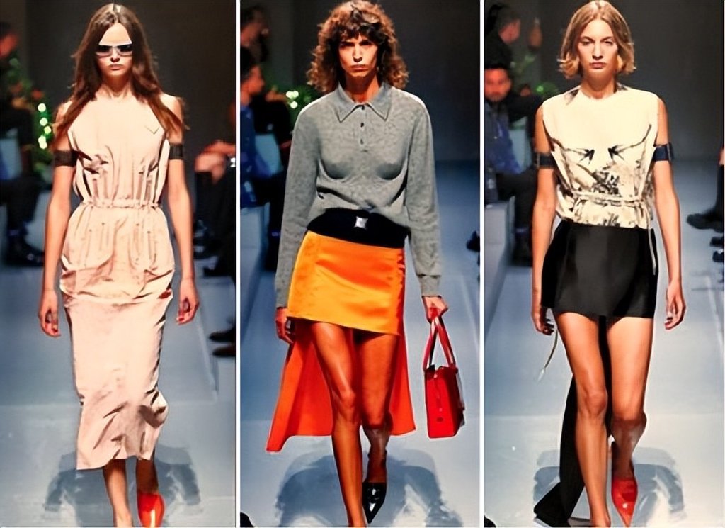Prada春夏在休闲单品上增加小设计,由左而右,洋装上有类似马甲鲸骨的细节;休闲的Polo衫由内加上胸罩细节,搭配晚礼服材质的拖尾迷你裙;无袖上衣饰有马甲绑带的细节。