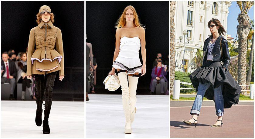 由左而右,Givenchy春夏在外套上加上马甲与小腰裙细节;Givenchy春夏将佳绩布背心上衣搭配晚礼服上会看到的立体褶皱细节;Celine春夏在常见的T恤、牛仔裤与皮外套组合中加上晚礼服般的蓬裙。