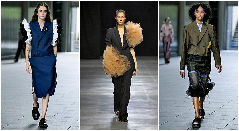 西装如何别出心裁?由左而右,Toga为西装加上蓬袖设计;Act n°1春夏在西装外套上加上晚礼服的层叠纱褶皱细节;Toga春夏在西装外套加上黑色晚礼服衬裙。